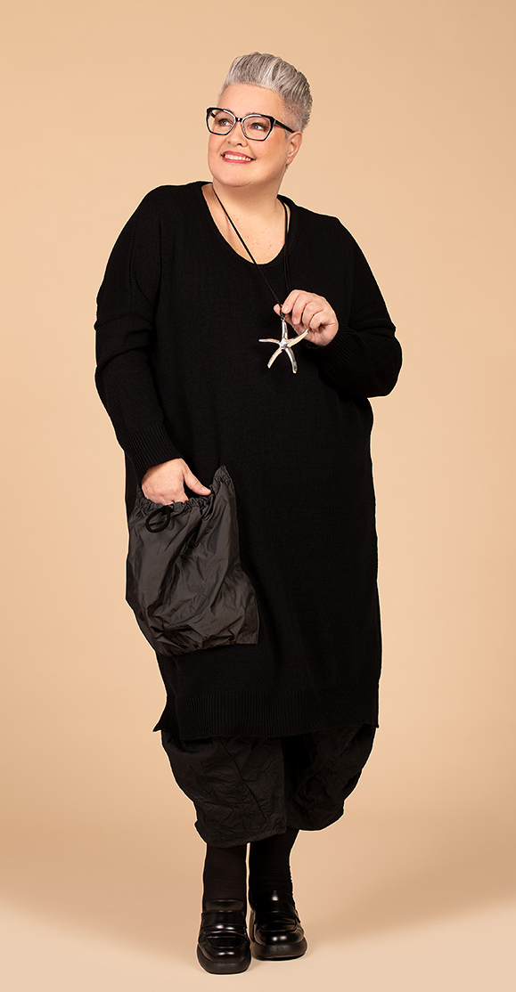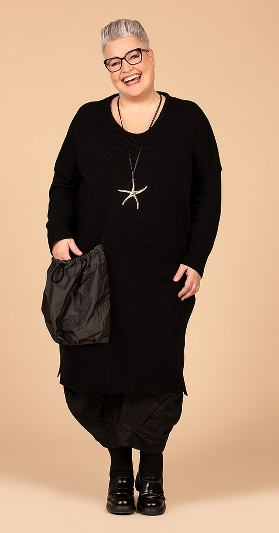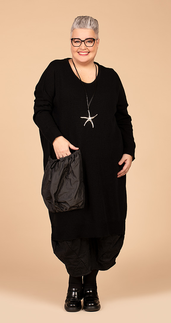 AKH Ganzjahr Kleid in gerader Form aus weicher Strick Qualität. Einheitsgröße, tragbar bis EU-Größe 68, wird gern auch von Kundinnen mit kleineren Größen oversized bzw. locker, leger getragen.