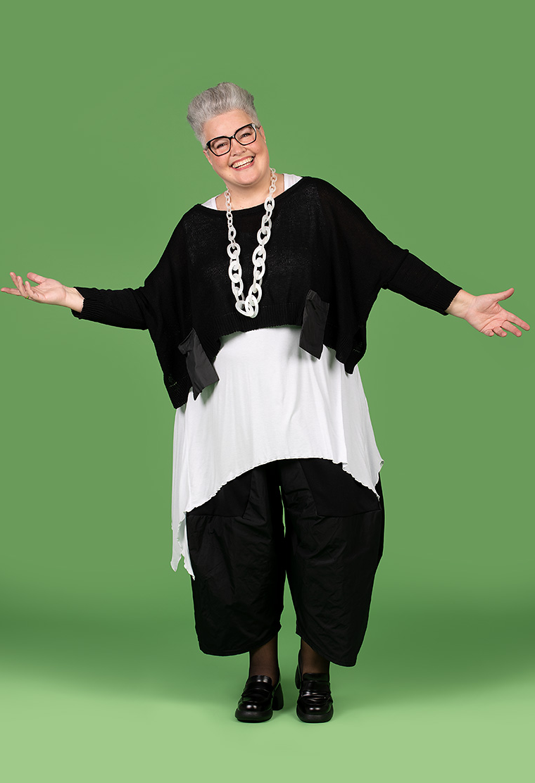 AKH Ganzjahr Überwurf in kastiger Form aus feiner Strick Qualität. Einheitsgröße, tragbar bis EU-Größe 68, wird gern auch von Kundinnen mit kleineren Größen oversized bzw. locker, leger getragen.