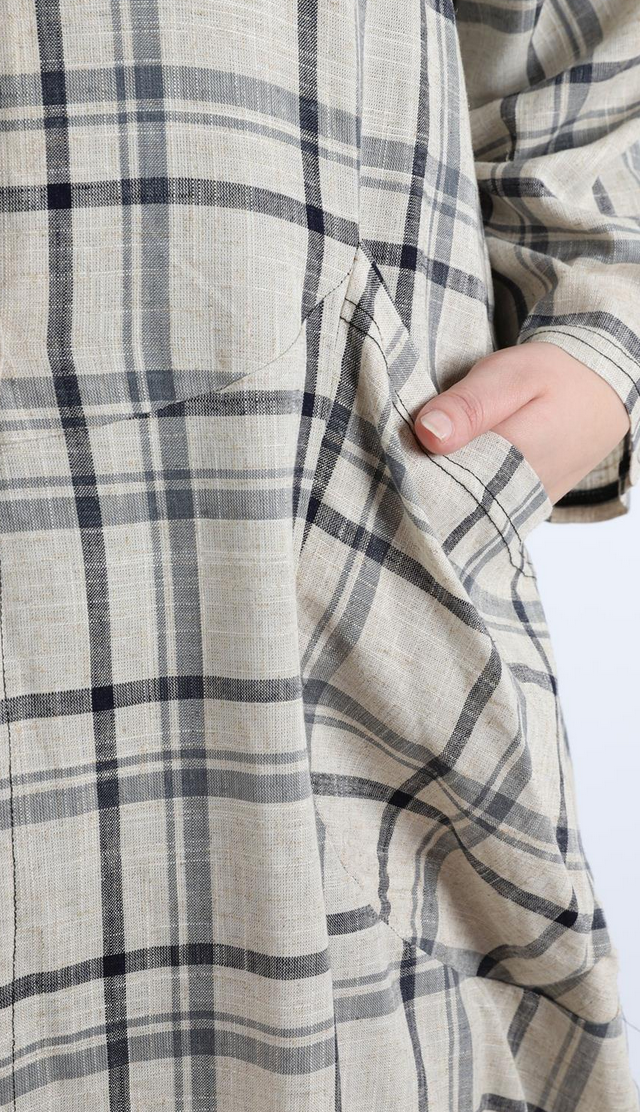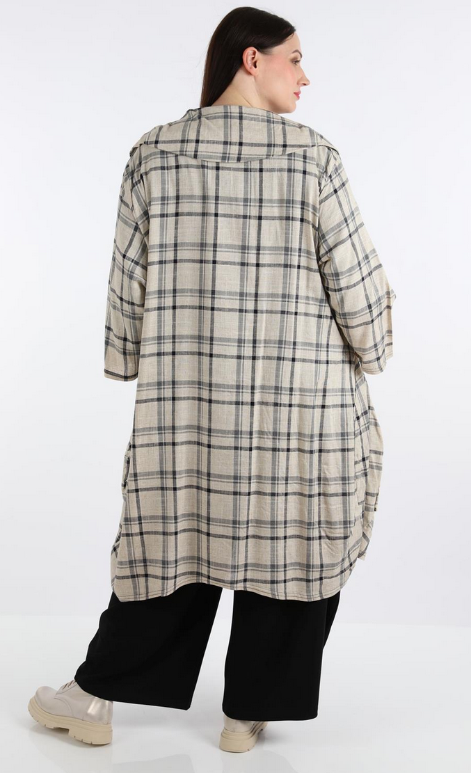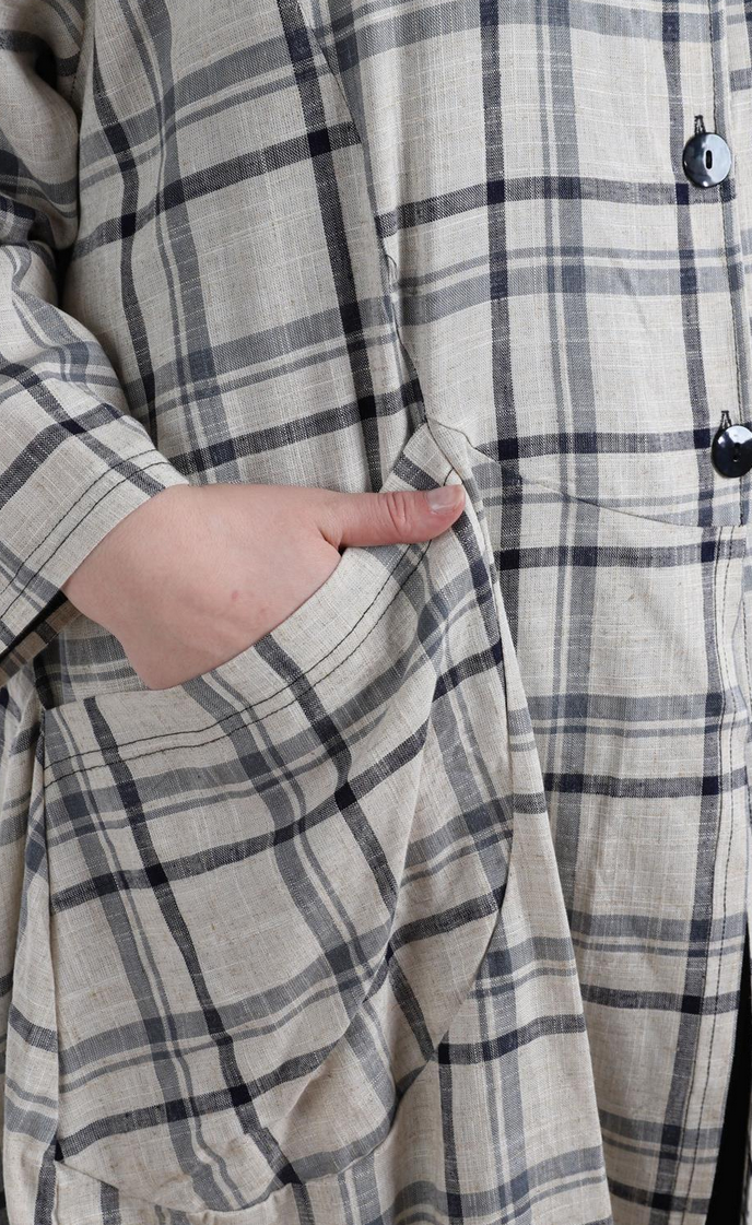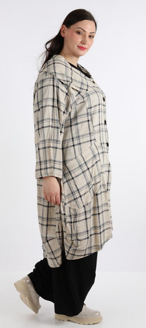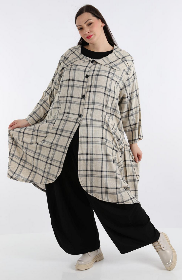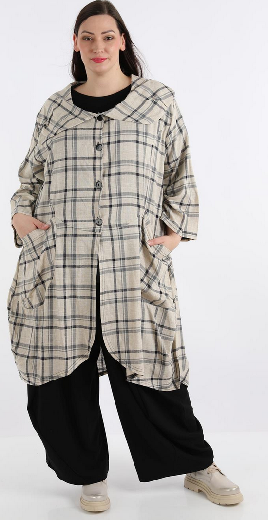 AKH Sommer Mantel in Ballon Form aus luftiger Leinen Optik Qualität. Einheitsgröße, tragbar bis EU-Größe 54, wird gern auch von Kundinnen mit kleineren Größen oversized bzw. locker, leger getragen.
