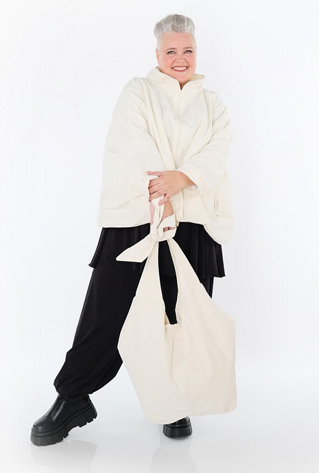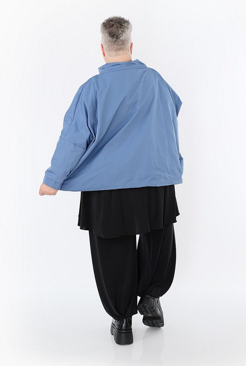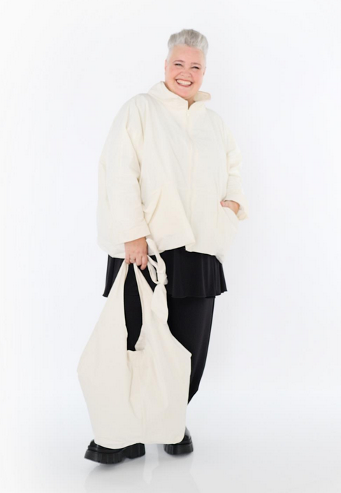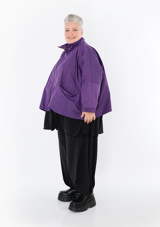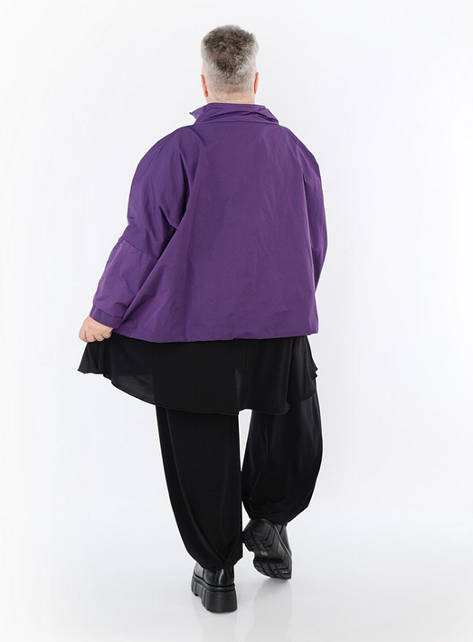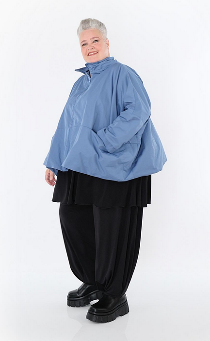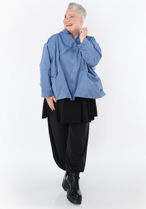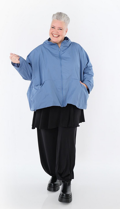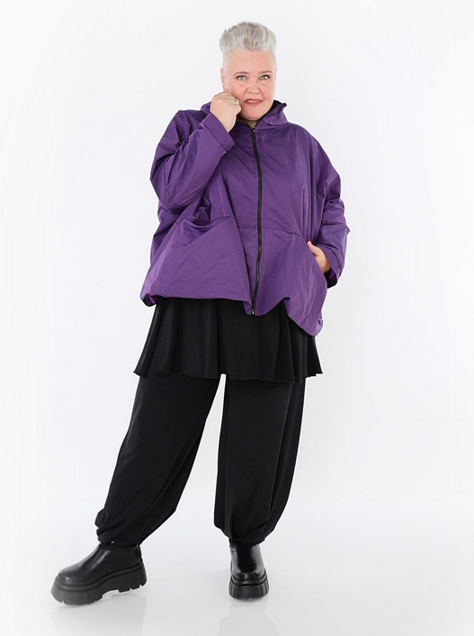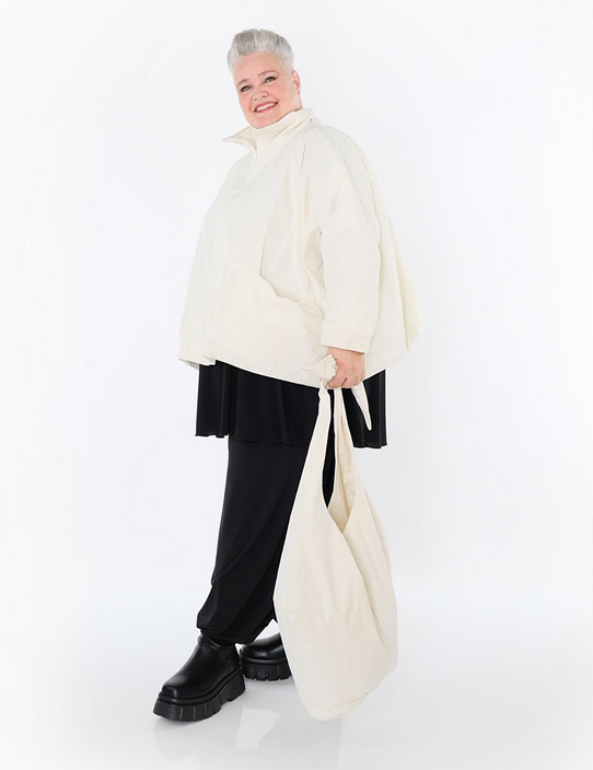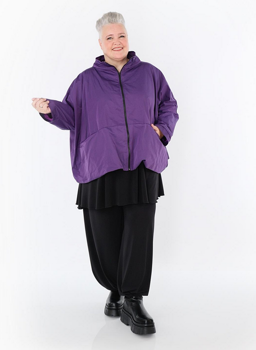 Ganzjahr Jacke in kastiger Form aus feiner Memorytaft Qualität. Einheitsgröße, tragbar bis EU-Größe 60, wird gern auch von Kundinnen mit kleineren Größen oversized bzw. locker, leger getragen.