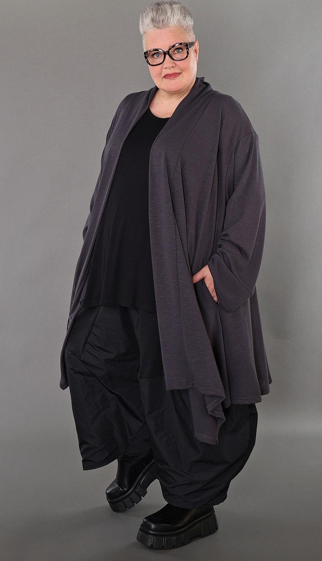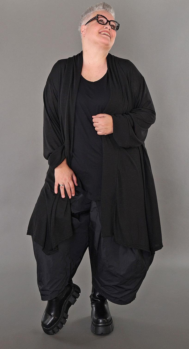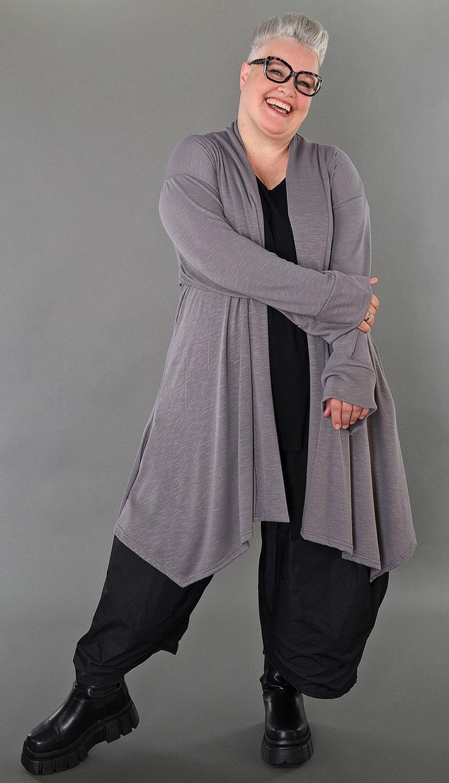 Übergangs Cardigan in A-Form aus weicher Feinstrick Qualität. Einheitsgröße, tragbar bis EU-Größe 58, wird gern auch von Kundinnen mit kleineren Größen oversized bzw. locker, leger getragen.
