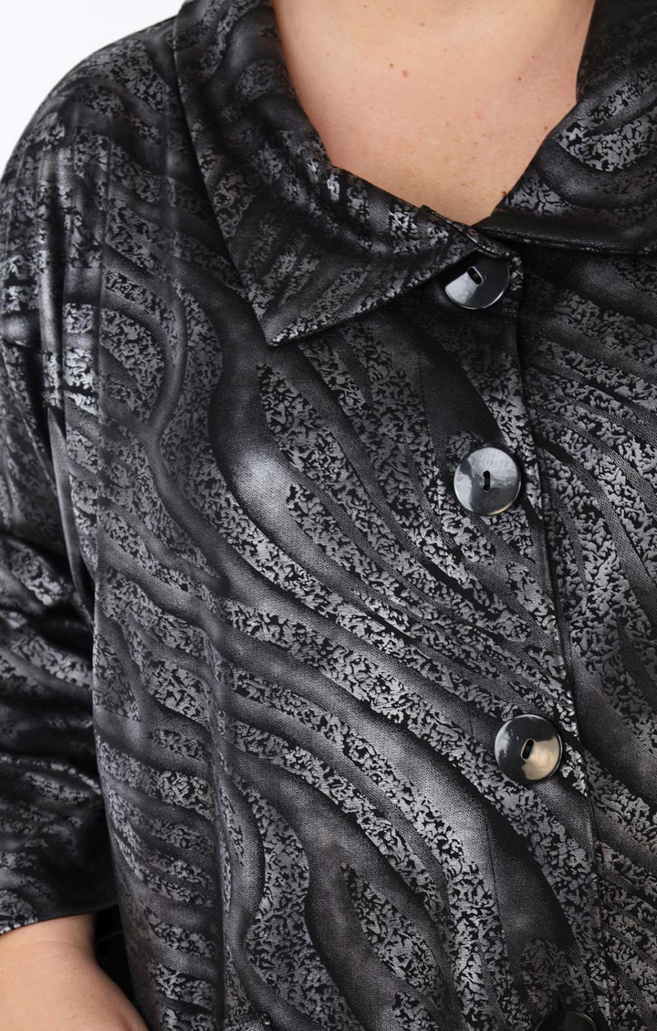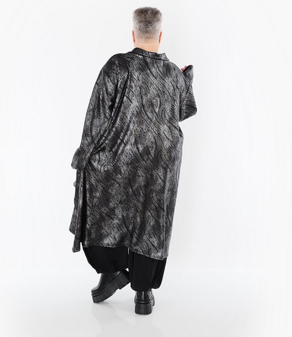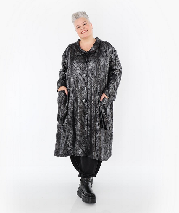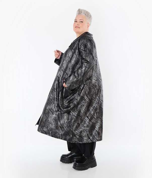 Winter Mantel in gerader Form aus feiner Lederimitat Qualität. Einheitsgröße, tragbar bis EU-Größe 58, wird gern auch von Kundinnen mit kleineren Größen oversized bzw. locker, leger getragen.